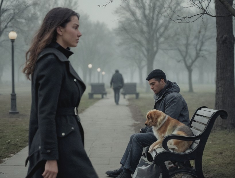 Poussée par la curiosité, elle décida de la suivre. La chienne traversa la place et gagna le parc voisin, là où une allée centrale, bordée de lampadaires, offrait quelques bancs et guéridons métalliques. Devant l’un d’eux, un homme au visage buriné, vêtu d’une vieille veste élimée, attendait. La bergère allemande se dressa sur ses pattes arrière et déposa délicatement la nourriture sur la table.