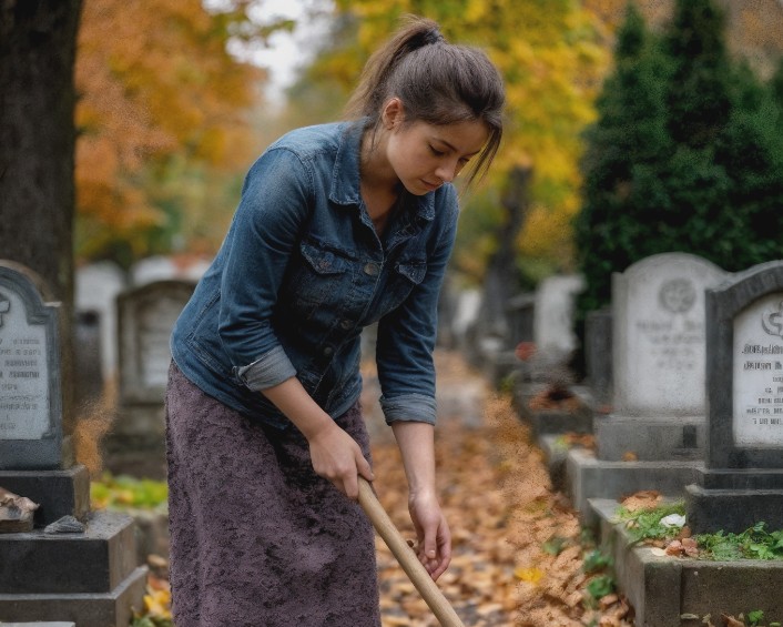 Quand le soleil se leva, elle prit un seau, une houe, une petite pelle et des sacs poubelle. Elle retourna là où elle avait terminé le nettoyage la veille. Elle nettoyait tout — les tombes, les allées, même celles dont personne ne s’occupait. Elle pensait que puisque le destin l’avait menée ici, tout devait être propre et beau. Sa vie avait pris cette direction pour une raison.