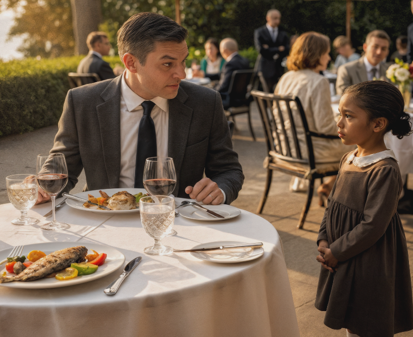 La voix, fine et tremblante, venait de derrière la table où dînait Edward Mitchell, magnat de l’immobilier dont on murmurait le nom autant qu’on le redoutait. Il releva lentement la tête de son verre. À quelques pas, une fillette de sept ans tout au plus, au visage maculé de poussière, le regardait sans ciller. Sa robe pendait en lambeaux, ses chaussures fatiguées grincèrent sur le carrelage, et entre ses doigts, un gobelet fendu tintait de deux ou trois pièces égarées.