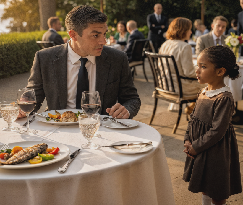 La voix tremblante surgit derrière la table où dînait Edward Mitchell, magnat de l’immobilier dont le nom suffisait d’ordinaire à faire taire une salle. Il leva les yeux de son verre et resta pétrifié. À quelques pas, une fillette de sept ans à peine, le visage poudré de poussière, des mèches collées au front. Sa robe pendait en lambeaux, ses chaussures tenaient par miracle, et elle serrait un gobelet en plastique fendu où tintaient quelques pièces.