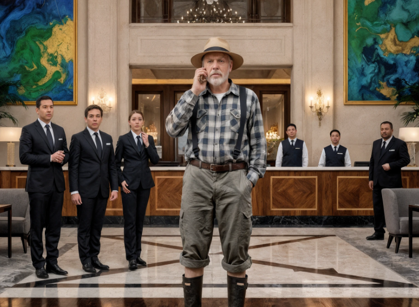 En fin d’après-midi, un homme d’une cinquantaine d’années entra doucement dans le hall de l’hôtel le plus chic de la ville. Sa peau était marquée par le soleil et le vent, ses traits portaient la fatigue des longues journées aux champs.