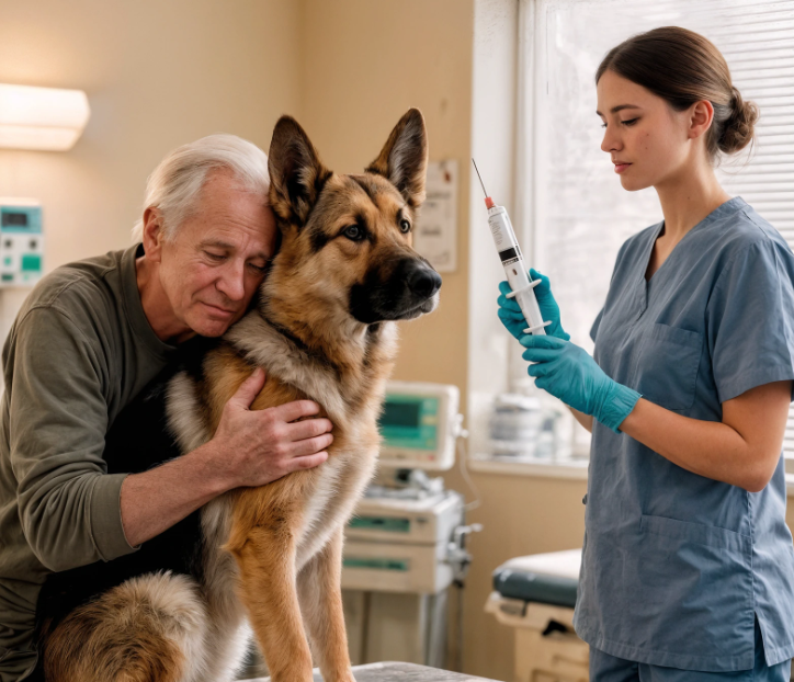 Le chien s’agrippa une dernière fois à son maître, blottissant sa tête contre lui, juste avant que l’injection ne soit administrée. La salle était figée, lourde de silence. Puis, brusquement, la vétérinaire haussa la voix : « Arrêtez tout ! »