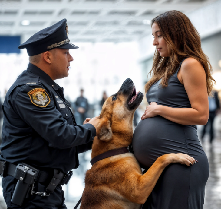— S’il vous plaît… éloignez-le… — souffla-t-elle, cherchant du regard quelqu’un pour l’aider. Sa voix tremblait, son visage était blême, traversé par la panique. Mais le chien — Bars — ne bougeait pas d’un centimètre. Ses yeux, d’ordinaire sûrs et professionnels, semblaient cette fois chargés d’une inquiétude presque humaine, comme s’il voyait un danger que personne d’autre ne percevait.